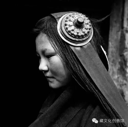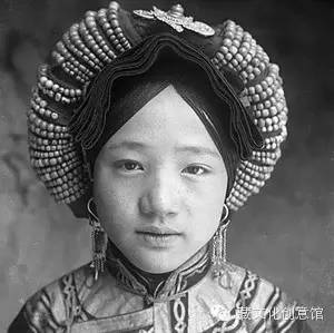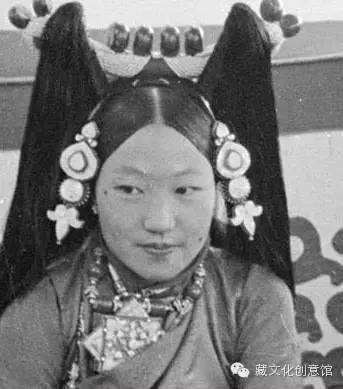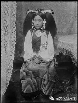 1939摄于四川理塘,理塘牧民少女,细辫如丝,穿氆氆衣,头顶银盾二枚。