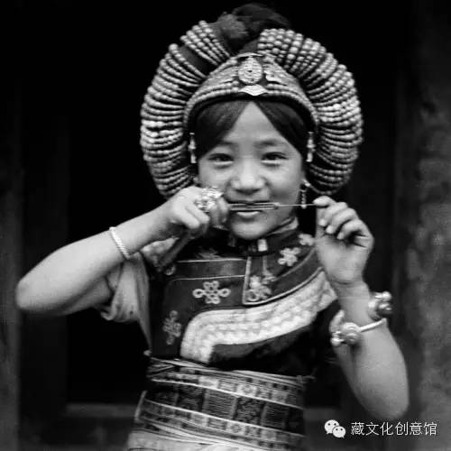 1934年摄街四川理番,阿坝理番藏族,讲“嘉戎”话。这个嘉戎贵族少女,以红珊瑚珠盘成头饰,身穿花衣,腰缠花带,耳带珊瑚银环,为当时贵族盛行的 一种装束。图中少女正在吹口弦,奏时用线扯动竹簧,发声清越为竹制口琴也。