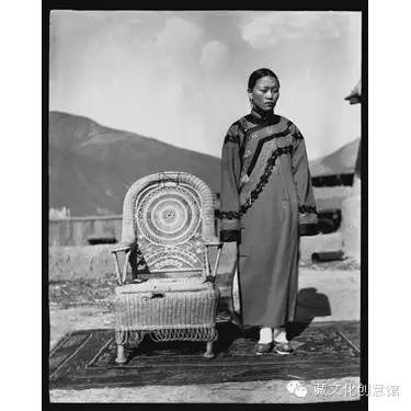 1936年摄于甘肃夏河,拉卜楞贵族妇女梳细辫,耳戴金质松绿石珠圈,红珊瑚耳坠,颈中挂珊瑚项链和镂金经盒,穿金丝缎皮袄,獭皮镶边。她一身穿戴,价值千金。