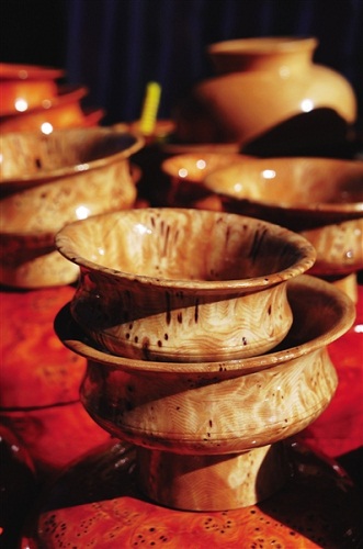一只漂亮的木碗从开始制作到完工需要12道工序。****的木碗当地人称之为“宝木碗”,是用硬木树根或树瘤加工制成,木质细密坚硬,花纹别致美观,用它饮酥油茶和盛酒有一种特殊的香味,而以岩柏、白青和桦树树瘤制成的木碗还有防毒的功能。一个上等木碗价值10头牦牛,一般人家不敢问津,但也会尽量弄个像样的,以慰平生。