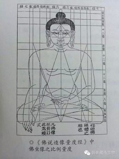 佛的形象一般是出家比丘相,头顶有肉髻,头发呈右螺旋状,身穿通肩或者袒右肩袈裟。佛类造像有三十二相、八十种好之说,不管是在绘制还是塑造佛的造像时必须严格按照《度量经》来进行创作。三十二相指不同于凡人的三十二种奇异妙像特征,如双肩圆满、广长舌相、眉间有白毫等等,八十种好指的是佛的头、面、耳、鼻等处具有八十种细微精妙的特征,大都是隐藏不漏的。佛的相好是古印度人赋予释迦摩尼的形象特征,反映了当时印度人的审美标准,后来成为塑造一切佛像共同遵循的模式。根据于小冬先生的研究,《度量经》在10到13世纪尚不成熟,也没有起到广泛传播的作用。在以后的几百年里《度量经》越发显的重要,逐渐成为造像遵循的****法度。