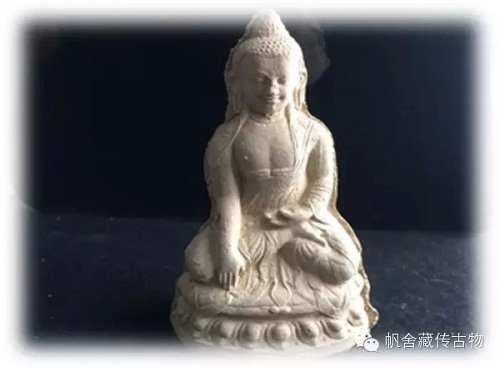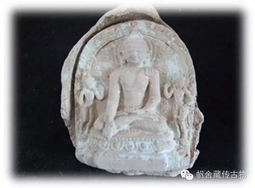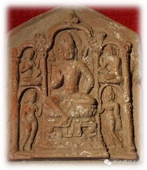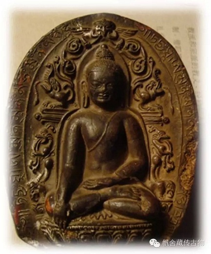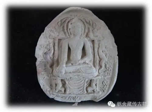 图(四)可以理解为是过度时期的擦擦造像,此时的释迦摩尼造像已经融入了部分西藏的地方特征,脸逐渐显的方正,宽额圆下巴,五官精致细腻,身体比例匀称得体,此时擦擦的形制和制作都已经逐渐西藏化。