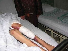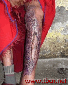 待做手术的伤腿 烧伤时的腿部,露出胫骨