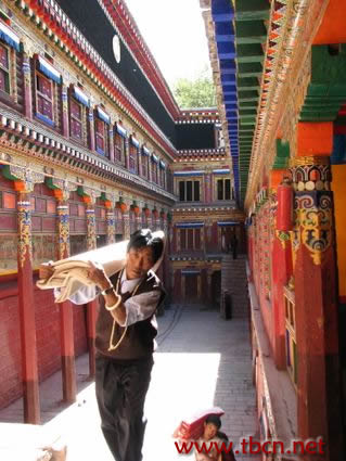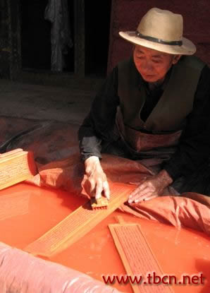 我们在参观德格印经院的时候特别注意到印经院的建筑是由两排主楼构成的,中间是空的,由走廊把这两排建筑连接起来,其实,走廊就是工人们印制经文的地方。这中空的建筑特色正好是为了工人们在劳作时有良好的采光。一年中,大概有半年的时间工人们可以印制经文,这些工人的年龄也不大,有的就只有18、19岁,但是他们工作时的动作特别娴熟和快捷。据说,他们每个工人一天要印经文2400张左右。看到他们那么辛苦地印制这些经文,我们也不由得产生了一种敬佩的感情。