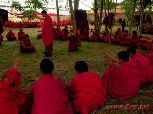 学习的经书:以本派的全知郭屋绕降巴·索南僧格(福狮)和大堪布阿旺曲扎(语主法称)的著作为主,也讲授山居噶丹派(噶丹山派。藏传佛教格鲁派祖庙噶丹寺,建于拉萨东郊卓日沃切山上,故有此名。)的“四著作”之中的全知绛央协巴(即嘉木阳协巴·阿旺尊珠,生于甘肃夏河,21岁赴藏,任哲蚌寺果芒僧院堪布。62岁回到甘、青一带,倡建拉卜楞寺,从此历代转世,住持不断。著有文集十五卷。)的著作,同时在密教方面也建立了四续部的修供。从此以后,讲经修法的教授更加兴盛:从名叫法鼓喧响园或殊胜闻思洲的显教学院中,分出红白显色(学习摄类学的初级单元)、略本摄类学(简略摄类理论。初学者初学赤白显色、反是反非、简明因果、总别、实质反体、相违相属等时所学科目。)、广本摄类学(详细的摄类理论。高等程度学者所学摄类科目如应成详论、遣余、遣除趋入、成立趋入、因果详论等。)、因类学(因类论著。叙述关于论证量学理路中正因与似因等种类的著作。)、般若初级班、《现观庄严论》****品、第四品、《中论》、《俱舍论》、嘎让(学习律经)等十个学习班。每个班长短背诵,反复背诵,记诵,辩论考试,班级辩论等,均按照大寺院的传统例规奉行,这种传统直到现在之间仍未失坏地延续且发展着。