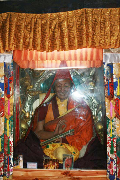 今天,我们又看见了老法王的眼睛,还是那样明澈,还是那样慈祥,那样庄严。可是,1005年以来,老法王的身躯已经换成了蜡像,蜡像居然又自己长出了头发!他的真身缩为一尺多高的舍利,供奉在旁边。他生前的一些用具,如铃杵、眼镜、茶杯等,陈列在一个简陋的玻璃柜里。一排排的佛像与经书,还像生前一样供奉着。