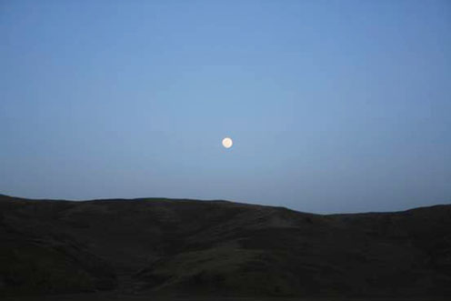当我们沿着河边的道路上山时,惊喜地发现,一轮圆月正在对面山上冉冉升起。山峦似一字长蛇,起伏不大。正值月圆之夜,明月刚刚升起,离山顶不足一丈。月亮像一个玉盘,明亮皎洁,光华内蕴,静谧安详,仿佛散发着浓浓的桂香,让人体会到心地无边,宁静悠远。一旦上到山腰,月亮便光芒四射了。