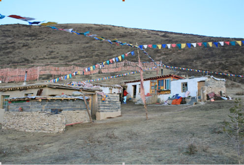 上师利用废弃的材料,建造了几间房子。一间供自己用,一间做厨房,一间铺上地铺用来接待弟子,一间留给大师兄不时来住。房子呈L形,面向东方。自愿来照顾上师的卓玛,带着他的丈夫、儿子,又在旁边搭了两间,形成了一个院子。院坝是山坡,没有平整。上师也仿佛有了一个家,其乐融融。