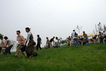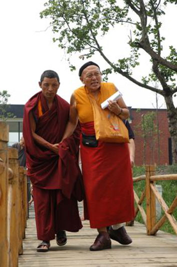 阿坝德普寺堪布华旦加措搀扶着腿脚伤痛的白雅仁波切